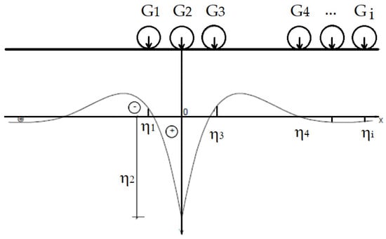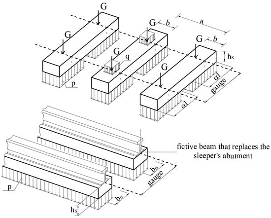 Following the rail wear measurements, the subsequent step involves calculating the bearing capacity of the rail affected by wear along the length of the studied curves. The rail bending stress is determined for the rail-sleeper frame, treated as a beam on an elastic foundation, using the Zimmermann theory. The virtual beam considered in the calculations is illustrated in Figure 4 and Figure 5. This method, initially developed by Winkler (1867) [] and Zimmermann (1888) [], is widely employed for its simplicity in rail design. Other approaches based on this model, such as those by Talbot (1918–1934) [,], Timoshenko and Langer (1923) [], and Clarke (1957) [], have been developed.