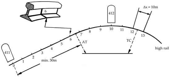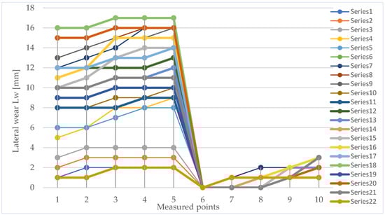Twice a year, measurements were conducted for a duration of five years on small radii curves subjected to mixed traffic, assessing both vertical and lateral rail wear. The measuring points are highlighted in Figure 7, and all observed curves feature the incorporation of transition curves and a central circle in their construction. Throughout the measurements, maintenance activities were carried out with a focus on monitoring the evolving characteristics of wear and geometric curves over time.