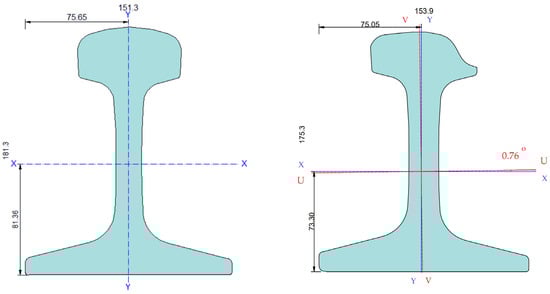 Here, AT denotes the alignment transition point, and TC designates the transition curve point. Figure 8 showcases the initial rail profile type 65 alongside the maximum wear profile identified during the investigations. Relevant properties for both profiles are detailed in Table 3.