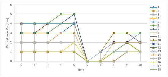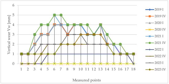 Evolution of vertical wear for curve 1, years 2019–2023, over time, for the 18 measured points.
