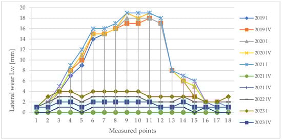 Evolution of lateral wear for curve 1, years 2019–2023, over time, for the 18 measured points.