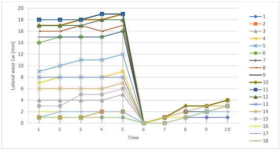 Figure 9, Figure 10, Figure 11, Figure 12, Figure 13, Figure 14, Figure 15 and Figure 16 offer a comparison of the wear propagation rate throughout the five-year study on the two curves, featuring discernible values post rail replacement. Each measured point on the outer rail illustrates both lateral and vertical wear rates, reflecting an average speed increase of 1 mm/year.