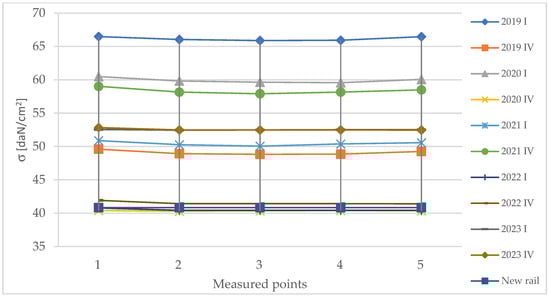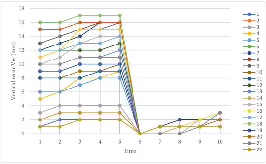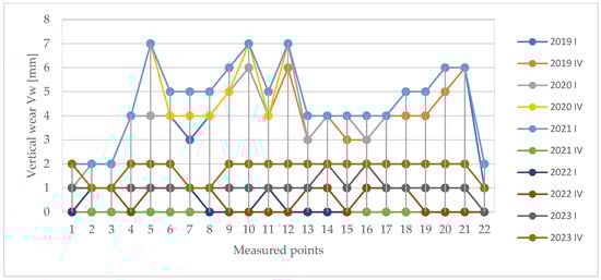 Measurements for R 275 m curve, for time interval 2019–2023, for vertical wear (Vw), are shown in Table 4.