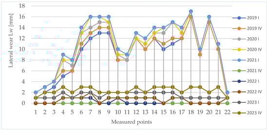 Measurements for R 275 m curve, for time interval 2019–2023, for lateral wear (Lw), are shown in Table 5.