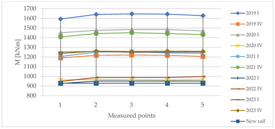 Notably, a sleeper change (2019 I–2019 IV) requiring ballast bed tamping resulted in a reduction in bending moments by up to 25%, compared to the initially registered 63%, and unitary efforts decreased by up to 35%, compared to the initially registered 78%. This indicates a moderate 40% decrease in efforts due to ballast bed tamping under conditions of maximum rail wear rates.