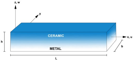 For a ceramic–metal FGM beam (see Figure 1) having a length L, width b, and thickness h, the geometry of the beam, its material properties, and volume fraction are expressed in Equations (1)–(3). Considering the rule of mixture, the effective material properties P can be written in terms of volume fraction, as shown below: