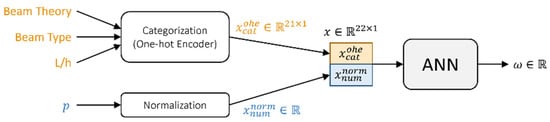 In this study, we aimed to predict (i.e., dimensionless frequency) from 4 inputs, which are the beam theory, beam type, L/h, and p, as shown in Figure 2. Since the first three variables represent categorical values, for instance, L/h is drawn from a finite set of {5, 10, 20, 30, 100}, we are encouraged to use a categorization technique. One commonly used approach is one-hot encoding, which transforms a categorical input denoted as xcat, with d distinct categories, into a one-hot encoded vector Rdx𝟙. In this encoding, the corresponding category is assigned the value 1, while all other categories are assigned the value 0 in . Moreover, the final variable, denoted as p, represents a numerical value of . Consequently, we use a normalization procedure with the objective of centering its mean at 0 and standardizing its deviation to 1, shown as . This normalization step’s purpose is to enhance training stability and accelerate the convergence of neural networks towards optimal solutions.