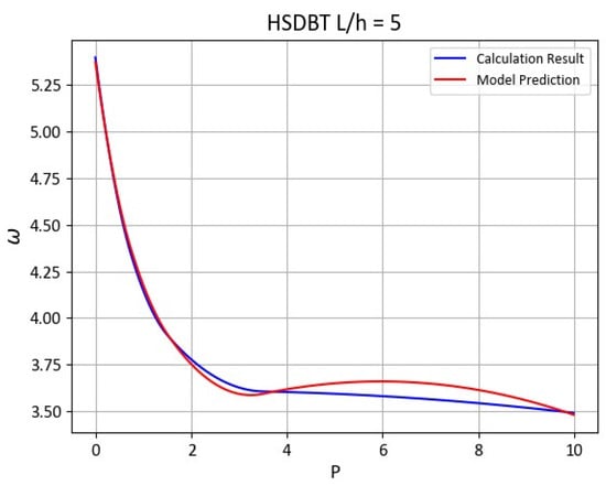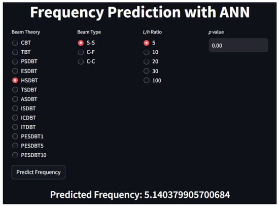 In the case of the ANN solution, the following parameters are considered as input data: span-to-height ratio, L/h = 5 and L/h = 20; beam type, simply supported (S-S), clamped-clamped (C-C), and clamped-fixed (C-F); beam theory, higher-order shear deformation beam theory or shear deformation theory (HSDBT or HSDT), CBT, TBT, ESDT, etc. (see Figure 4); and the power law varying for values 0–10. All of the results were calculated and plotted only for the HSDT and CBT in simply supported FG beams by only considering the first mode (m = 1). To validate the accuracy of the analytical method and ANN predictions, the non-dimensional frequencies (ϖ) obtained by the presented approaches were compared to a reference study conducted by Thai and Vo [5].