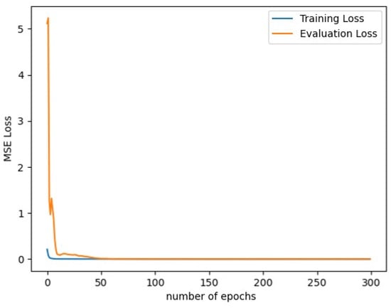 We implemented the ANN model using PyTorch [24]. Moreover, we designed an interface for the purpose of input provision and prediction retrieval, as illustrated in Figure 4. Then, the model was trained by the selected hyperparameters for a maximum of 300 epochs on the dataset collected from [5]. The resulting training and test losses can be seen in Figure 5. After 300 epochs, the model achieved an MSE of “0.00047” in the training dataset. Furthermore, Table 1 shows the actual and predicted frequencies for the given inputs. Through the results, the ANN model demonstrated that it predicts accurately.