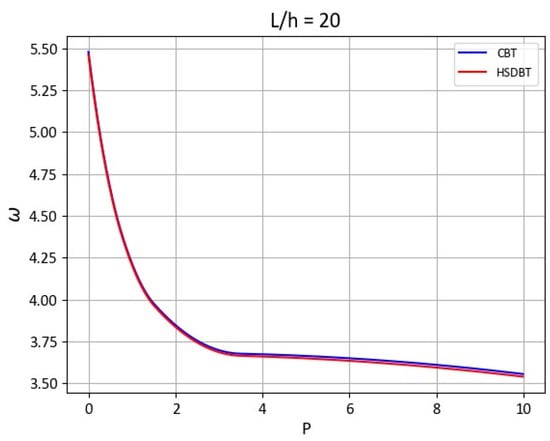 Non-dimensional frequency comparison obtained from CBT and HSDBT for L/h = 20.