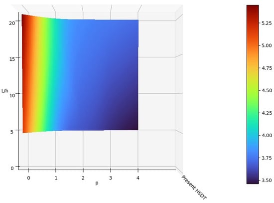 To comment on the values in the graphs, Figure 5 and Figure 6 indicate the change of ANN prediction values according to the L/h ratio. As can be seen from the 3D graphics, higher frequency values were obtained for the same power law index values stemming from the increase in the span-to-height ratio. Figure 7, Figure 8, Figure 9, Figure 10 and Figure 11 show the non-dimensional fundamental natural frequency versus the volume fraction exponent (p) for different values of the span-to-height ratio L/h. It can be understood that the lowest dimensionless frequencies are obtained for full metal (p → ∞). In addition, Figure 12 demonstrates the variations in the dimensionless frequency values attained as a result of the present study that depend on the projective span-to-height ratio L/h.
