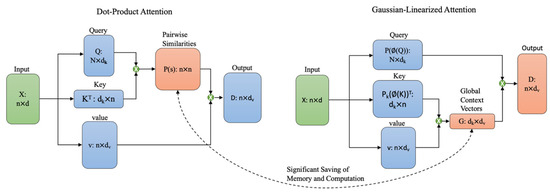 Illustration of the architecture of dot-product and Gaussian-linearized attention.