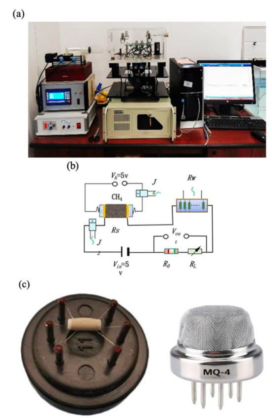 (a) Experimental system diagram for methane gas sensor array; (b) Gas sensor circuit diagram; (c) The pictures of methane gas sensor.