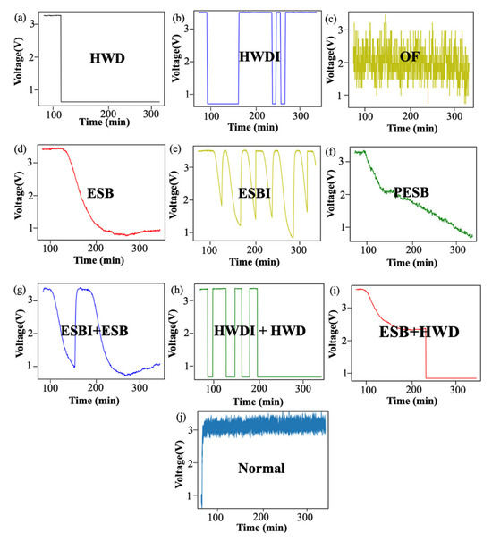 Different kinds of original signal faults and original methane gas, (a) The signal of the HWD Fault; (b) The signal of HWDI Fault; (c) The signal of OF Fault; (d) The signal of ESB Fault; (e) The signal of ESBI Fault; (f) The signal of PESB Fault; (g) The signal of ESBI + ESB Fault; (h) The signal of HWDI + HWD Fault; (i) The signal of ESB+HWD Fault; (j) The signal of normal.