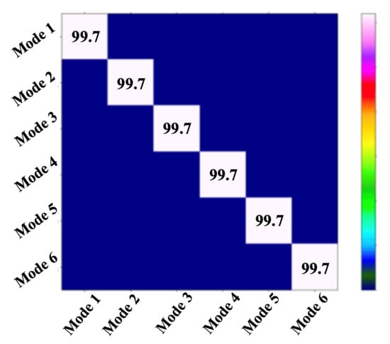As shown in Figure 7, the result of sensor fault diagnosis shows that the classification accuracy can reach as high as 99.75%. It can be seen from the accuracy confusion matrix that the accuracy of the six modes has reached a very high level, and there is no interaction between the modes. This shows that when the model learns different patterns, the abstract features are fully learned, and the high quality of data is also one of the reasons for the good experimental results.