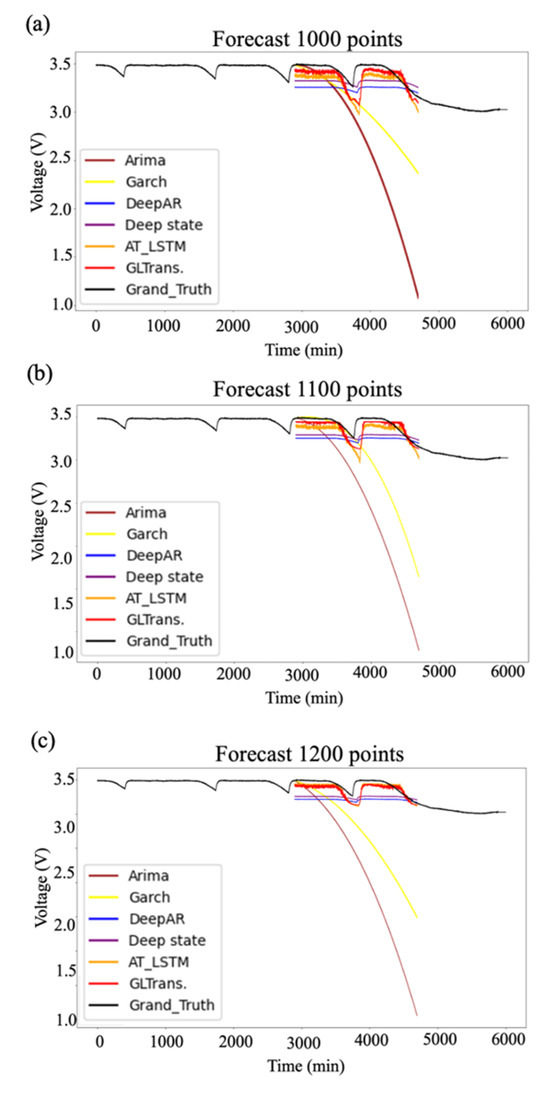 The results of sensor fault predictions shown in Figure 8a–c represented the results of predicting 1000, 1100, and 1200 points, respectively. From Figure 8, the prediction results of traditional statistical models are relatively poor, followed by the statistical models DeepAR and Deep State which combine with neural networks. Because AT-LSTM has the attention mechanism and was combined with the LSTM model, which was suitable for the prediction task, the prediction effect is the best among the comparison models.