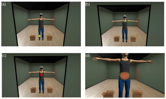Example of ABMT trials, with the three possible figures and colors: (a) Yellow triangle on the right leg; (b) Green triangle on the left shoulder; (c) Red square on the chest; (d) Close-up of the body after the red circle on the stomach disappears and the surrounding body areas are illuminated.