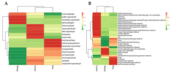 - Põlme, S.; Abarenkov, K.; Henrik Nilsson, R.; Lindahl, B.D.; Clemmensen, K.E.; Kauserud, H.; Nguyen, N.; Kjøller, R.; Bates, S.T.; Baldrian, P.; et al. FungalTraits: A user-friendly traits database of fungi and fungus-like stramenopiles. Fungal Divers. 2020, 105, 1–16. [Google Scholar] [CrossRef]