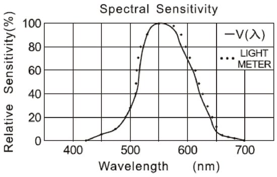 According to Sauter SO 200K lux meter technical specifications [], its spectral sensitivity was sufficient for measuring illuminance in this wavelength range (Figure 2).