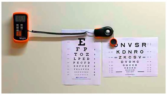 The charts were placed on a white wall illuminated by fluorescent light bulbs. No considerable amount of natural light was present in the room. Illuminance was measured using the Sauter SO 200K digital light meter with a reading accuracy of ±3% rdg ± 0.5% f.s [], with an average value of the measurements being with a value of 662 ± 6 lux. This illuminance distribution is considered even. The authors defined deviation values of ±10 lux as acceptable, and as long as measurement results are within the acceptable interval, their variations will not be considered.