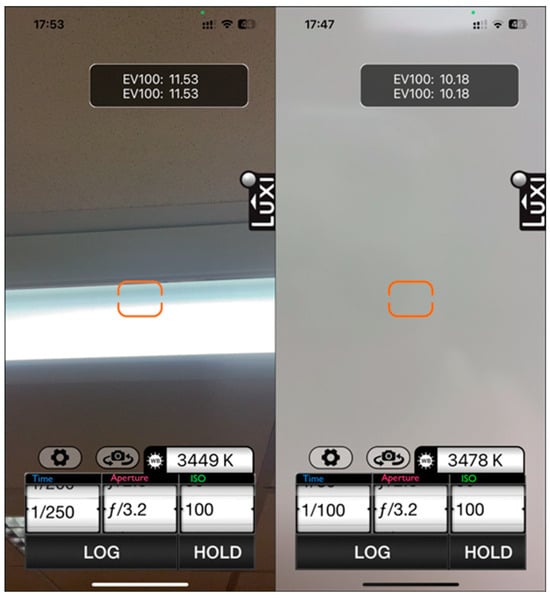 The color temperature was measured using the Pocket Light Meter app by Nuwaster studios [] on an iPhone 13 Pro front camera [] (Figure 4).