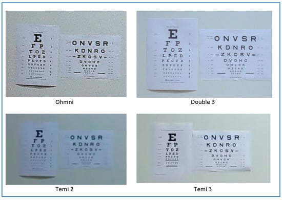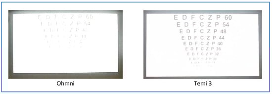 The experiments included four models of TPRs: Double 3 by Double Robotics [], Ohmni by Ohmnilabs [], and Temi 2 and Temi 3 by Roboteam Home Technology []. They consisted of two separate sets of measurements: (1) measuring visual acuity using the Snellen and LogMAR charts at a distance of 3 m and with an illuminance of approximately 600 lux, as recommended for these charts [,]—(“It is recommended that VA assessment always be performed between 400 lx and 600 lx, as this limits any effect of illuminance change to 0.012 LogMAR”); and (2) measuring the text readability on the wall projector in the class at the distances of 5 m and 10 m. Image acquisition was performed by taking screenshots with the Windows Snipping tool in the lossless format PNG (Portable Network Graphics) [,] and using the robots’ integrated functions of storing still images from the camera, where available.