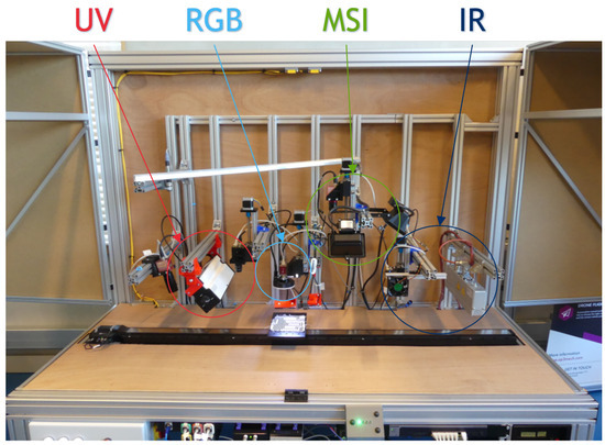 The objects of interest were placed on a translation stage that moved with a fixed speed of 15 mm/s. The cameras were placed above the translation stage and pointed downward, perpendicular to the translation. A corresponding light source (heating source for IR) provided continuous illumination during the experiments. An image of the setup can be seen in Figure 2. An enclosure was made to block harmful UV radiation during the measurement.