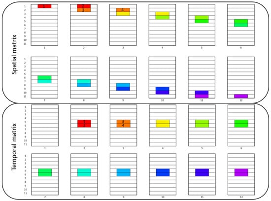 Figure 4. Transformation of the spatial matrix of the raw images into a temporal matrix . The first two rows of the images show the spatial matrix , and the last two rows show the stitched temporal matrix . The colors correspond to the moment after passing the light source. The color red corresponds to the spatial matrix directly after passing the light source. Matching colors are combined in the same image from the temporal matrix. For the first five reconstructed sections, these are numbered, meaning that number 1 in the spatial matrix will be located at number 1 in the temporal matrix. The numbers below the matrix represent the frame number and the numbers on the right indicate the line number of a single frame. - Preprocess dataDepending on the camera type, preprocessing is required, e.g., NUC (non-uniformity correction) for IR cameras or demosaicing for snapshot HSI cameras.
