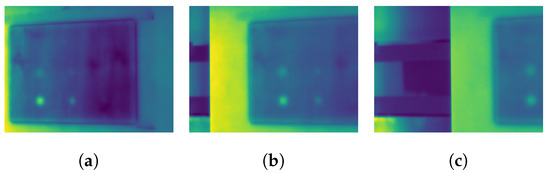 Three frames from the sequence captured by the IR camera while moving the object. (a) Frame 300; (b) frame 550; (c) frame 800. The frames correspond to an number of seconds after passing the heating source. (a) 10 s; (b) 18.3 s; (c) 26.67 s.