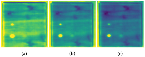 A commonly used inspection sample in active thermography is a flat bottom-hole plate, as shown in Figure 5. The air trapped in the voids cools differently than the surrounding material. As heat is trapped, the air remains at a higher temperature and therefore shows up as a hotspot in the thermograms. Depending on the thermal properties of the sample material and the characteristics of the defects (depth, size, type of defect, …), the time needed to show a hotspot in the thermogram may vary. For this reason, the spatial image sequence, as shown in Figure 6, must be converted into a temporal image sequence, using the novel algorithm from Section 2.1. In the temporal data set, as shown in Figure 7, the sample under investigation remains at the same location and the cooling can be investigated. It is noticeable that the air pockets are smaller when the location from line source is further from the heating source. From Figure 6, it is noticeable that due to the angle of the camera, the edge of the object appears smaller than the same edge in image c. This effect only appears in the measured data. When the algorithm is applied to the measured data, a single location is used to reconstruct the object. Because the same location is used to reconstruct the image, there is no noticeable deformation of the object, as can be seen in the temporal matrix in Figure 7.