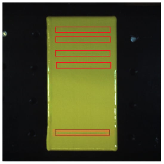 RGB image of the epoxy-coated steel sample with incisions. The incisions are marked with red squares. The sample has the following dimensions: 100 × 50 × 13 mm.