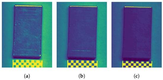 UV cameras can be used to detect scratches with higher contrast than with normal RGB cameras. However, an additional UV light source is required. These light sources produce a very narrow beam of light and therefore create an uneven illumination in the image, as can be seen in Figure 8. This algorithm not only facilitates measurements with heterogeneous illumination sources, which is a common challenge with hyperspectral imaging (HSI) or UV cameras, but also provides a solution that is particularly useful in industrial settings. Achieving even illumination can be difficult due to safety or financial constraints in such environments. By applying the same algorithm to reconstruct an image at a specific spatial location, it ensures even illumination, thereby enhancing the detection of defects. Selecting a single line position can address this issue. However, since the starting position is initially unknown, imaging the entire sample becomes necessary. Our innovative algorithm plays a crucial role here, enabling us to seamlessly stitch together the images. This process allows us to reconstruct the image at a specific, targeted location, effectively overcoming the challenge of the unknown initial position. The sample studied, which was used for this measurement, is an epoxy-coated carbon steel sample. Several incisions of varying depth were made in this sample using a knife blade. An RGB image of this sample can be seen in Figure 9. From the RGB image, it is difficult to see all the different incisions. When looking at the UV sequence in Figure 8, the lowest cuts are very visible in the first image and second image (Figure 8a,b) but they become less visible in the last image (Figure 8c).