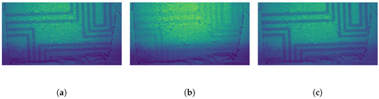 When the spatial matrix is converted to a temporal matrix, the object under study is recreated. Three separate frames from the spatial matrix can be seen in Figure 10. Each frame in the spatial matrix represents a different physical location and, in this case, a different intensity of the light source used. Figure 10a shows that on the first image, the incisions are most obvious, but other artifacts enter the image due to the reflection of the UV light. Figure 10b is better suited to analyze this type of defect. In Figure 10c, we notice a significantly darker image. This darkness is attributed to the algorithm reconstructing the image at a spatial position with less intense illumination, resulting in a darker appearance in the reconstructed output.