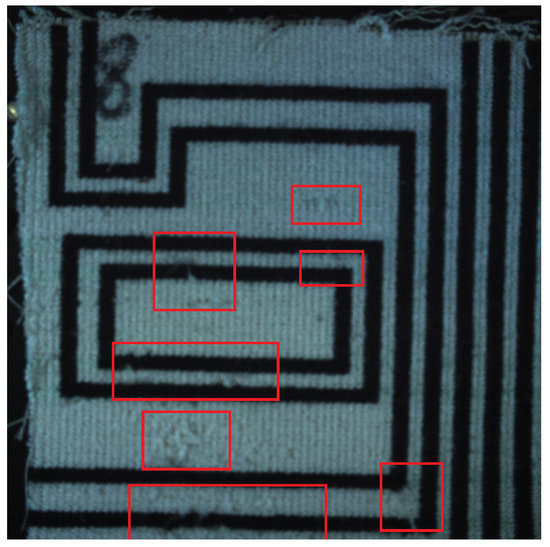 RGB image of the textile sample with defects. The defects are marked with red squares. The dimensions of the sample are 200 × 200 × 4 mm.