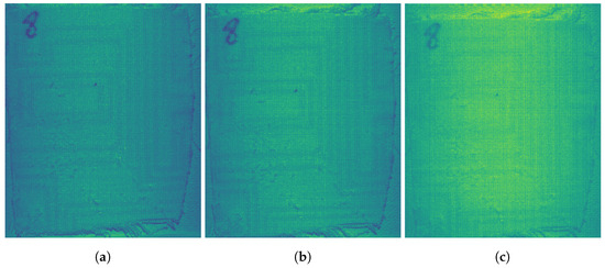 Figure 13 shows the temporal matrix for a single hyperspectral band. It can be seen that not only the choice of wavelength is important but also the temporal position to obtain a high contrast between the weaving defects and the normal tissue. In Figure 13c, for example, the illumination of this spatial position is too large, causing the object to be over-saturated.