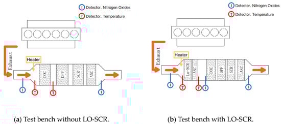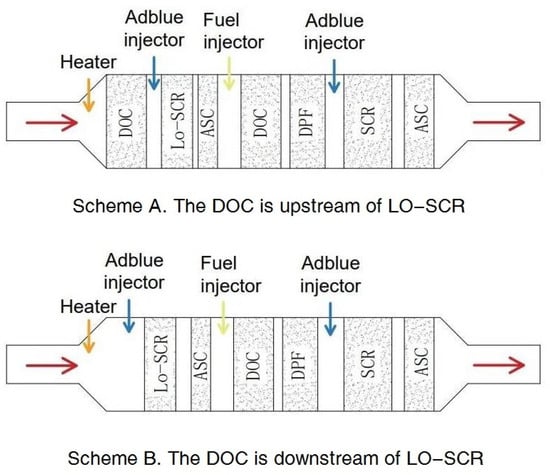 The relative location of the DOC, whether upstream (scheme A in Figure 1) or downstream (scheme B in Figure 1) of LO-SCR, also requires consideration. A DOC deployed upstream provides the possibility to partially oxidize NO into NO2 and increase the proportion of fast reactions. However, at lower exhaust temperatures, a higher NO2 concentration will increase N2O generation, [23], while, at higher exhaust temperatures, possible NO2 surplus caused by an increased generation rate in the DOC will further hinder the NH3–NOx reactions in SCR. Another problem for the upstream DOC scheme is its effect on exhaust temperature; at cold start conditions, the cold DOC upstream will delay the catalyst temperature increase of LO-SCR [4].
