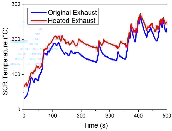 This paper was focused on reducing NOx emission at mid- to low-load working points, where exhaust temperature is relatively low. Therefore, the traditional thermal management of throttle valve opening adjustment and postinjection is insufficient in this case. A separate heater is placed before DOC, heating the exhaust before entering the EAT system, to effectively increase the catalyst temperature at a lower load. Temperature variations of the LO-SCR catalyst (at the inlet) before and after thermal management are given in Figure 4. After the application of an electrical heater, the SCR catalyst temperature increased by 25.75 °C on average during 0~500 s of WHTC.