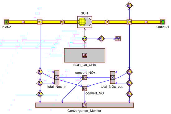 Modeling of the EAT system is focused on LO-SCR. The LO-SCR model was constructed in GT-Power(GT-SUITE version 2021), as shown in Figure 5. Related SCR parameters are given in Table 5.