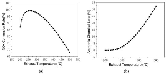 Reactions in SCR at different exhaust temperatures. (a) Changes of NOx Conversion Rate with Exhaust Temperature. (b) Changes of Ammonia Chemical Loss with Exhaust Temperature.