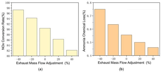 Reactions in SCR at different exhaust mass flows. (a) Changes of NOx Conversion Rate with Exhaust Mass Flow Adjustment. (b) Changes of Ammonia Chemical Loss with Exhaust Mass Flow Adjustment.