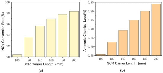 The effect of SCR carrier length is shown in Figure 8, with other parameters also remaining constant. Longer carrier length means a larger area and longer time for catalyzed reactions, which improves the NH3–NOx reaction rate and NOx conversion rate, even at lower exhaust temperatures. The conversion rate of NOx increases from 92.1% to 98.2% as the SCR carrier length increases from 100 mm to 200 mm. The NH3–O2 reaction rate is also significantly affected by the change in carrier length. At lower exhaust temperatures, as the carrier length increases from 100 mm to 200 mm, the ammonia chemical loss increases from 0.55% to 0.83%. Since the ammonia–nitrogen ratio is fixed at 1:1, the increase in the NH3–O2 reaction rate hinders the NH3–NOx reaction at longer carrier length. It is necessary to further improve the NH3–NOx reaction rate, and the ammonia–nitrogen ratio in steady-state working points should be greater than 1. It should be noted that a longer SCR carrier can store more ammonia, which may cause larger ammonia leakage at transient working points.