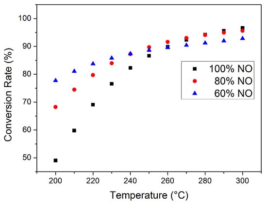 The effect of DOC on the NOx conversion rate after thermal management should also be emphasized. Nitrogen oxides generated during combustion are mostly NO, and the DOC at SCR upstream can partially oxidize NO into NO2. The NOx conversion rate at different SCR inlet NOx compositions (NO and NO2 only; other possible nitrogen oxides were neglected) is given in Figure 9, with the exhaust parameter and ammonia input remaining constant. The NOx concentration at the SCR inlet is higher than in Figure 6, Figure 7 and Figure 8 for better comparison. The effect of exhaust temperature at this working point is still generally positive for NOx conversion, while the effect of NO oxidization depends on actual SCR temperature. At lower temperatures with lower catalyst activity, a higher NO2 proportion can increase the proportion of fast reactions. With exhaust temperature at 200 °C, the NOx conversion rate of 40% NO2 (60% NO) is 77.57%, significantly higher than the 49.01% of 100% NO; at 250 °C, the difference caused by NO2 is limited. However, the consumption rate of NO is higher than NO2; thus, NO may be completely clarified before complete NO2 conversion, especially at higher temperatures, and NH3–NO2 reaction rate is significantly low and N2O is likely to be generated during this process. With 40% NO2 at the inlet and exhaust temperature at 300 °C, the NOx emission at the SCR outlet increased to 7.15%, while, with 100% NO, the emission is only 3.38%. It should be noted that the NOx at the SCR inlet in Figure 6, Figure 7 and Figure 8 is completely NO. The effect of DOC after thermal management requires further consideration.