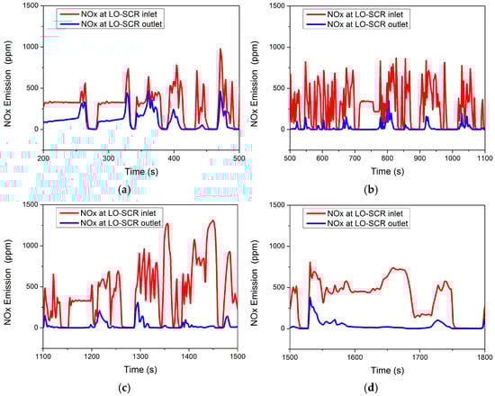 NOx at LO-SCR inlet and outlet during WHTC cycle at (a) 200~500 s, (b) 500~1200 s, (c) 1200~1500 s, and (d) 1500~1800 s.
