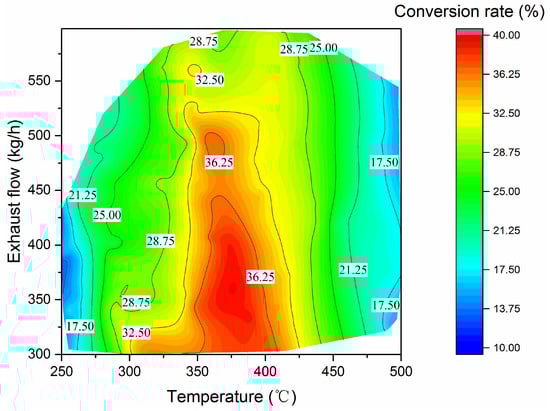 The NO–NO2 conversion rate within DOC at different exhaust temperatures and mass flows is given in Figure 11. When the exhaust temperature exceeds 425 °C, the conversion rate does not change significantly with the exhaust flow, while gradually decreasing with the increase in the exhaust temperature. Under medium load working points (in the range of 325 °C~425 °C), the exhaust mass flow has a significant effect on the NOx conversion rate in DOC, and the variety of conversion rates is limited at higher exhaust mass flow. The effect of exhaust temperature on NO–NO2 conversion rate is simple and significant. The high conversion rate mainly occurred between 350 °C and 400 °C, with medium to low exhaust flow rate from 300 kg/h to 525 kg/h. The highest conversion rate among all selected operating conditions is about 39.5%; the corresponding exhaust temperature and exhaust mass flow rate are 386 °C and 336.6 kg/h, respectively. It should be noted that the temperature is also within the optimistic temperature range of the SCR [17].