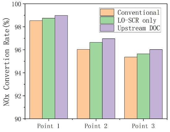 Figure 12 shows the NOx conversion rates at three different EAT system schemes of the working points under low- to medium-load conditions of the engine. Exhaust temperature is increased through exhaust electric heating, with or without upstream DOC, which is reflected in the figure as the NOx conversion efficiency at all three operating points being at a high level. At steady state and higher carrier temperature, the NO2 generated in DOC still increases the proportion of fast reaction in SCR and improves the conversion rate of NOx, which makes the NOx conversion efficiency of the scheme involving upstream DOC slightly higher than the other two schemes at the three operating points. Under three working conditions, the NOx emissions of the EAT system with upstream DOC decreases by 18.69%, 9.61%, and 14.15% compared to the conventional arrangement, although the NOx conversion efficiency increases to a limited extent compared to the other two EAT systems without upstream DOC. It should be also noted that, at cold start conditions, an upstream DOC will consume the heat of the exhaust and delay the catalyst temperature increase of LO-SCR and the effect on the cycle NOx emission may be negative.