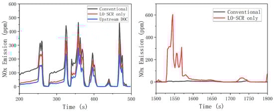 From 1500 to 1800 s, there was a significant difference in nitrogen oxide emissions between the EAT system with LO-SCR and the conventional arrangement system of 1500~1600 s. The increase in average exhaust temperature caused by thermal management increases the reaction rate between ammonia and oxygen, resulting in the increase in the ammonia chemical loss. If the urea input is not adjusted after thermal management, the ammonia storage is insufficient at 1500 s, which, in turn, leads to significant NOx emission. The problem can be largely avoided by proper urea input adjustment.