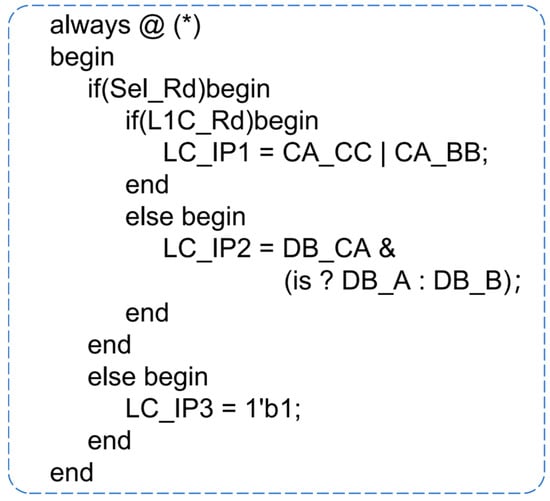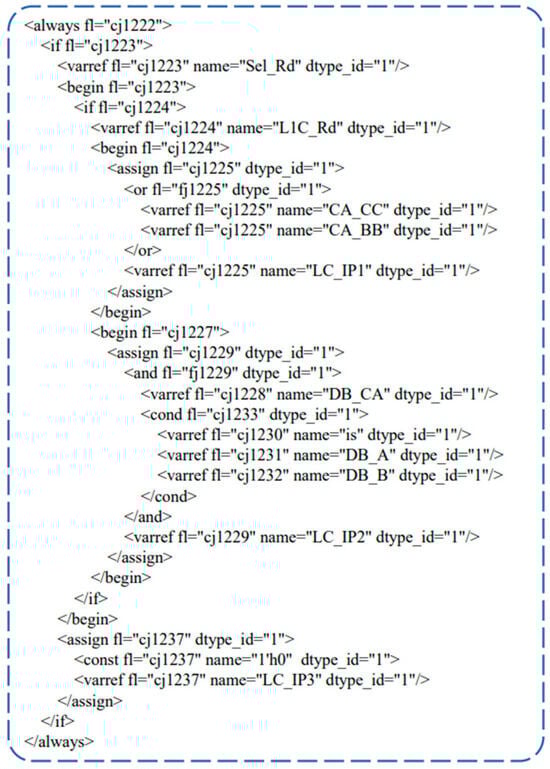 where represents the resulting syntax tree, denotes the data relations in XML, and represents the analysis algorithm. When combining the results of Formula (1) to reshape the RTL code, the emphasis is on the regularity of the derivation process and the correction of syntax: