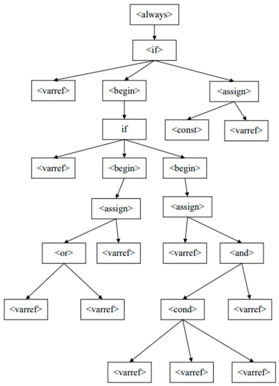 After a detailed analysis of the content within the <always> tag, the corresponding syntax tree is illustrated in Figure 2. The root node of the syntax tree is <always>, and its two sub-tags become sibling nodes at the second level. The sub-tags contained within the second-level node tags further become nodes at the third level, and so on, resulting in the derivation of a comprehensive structure for the syntax tree.