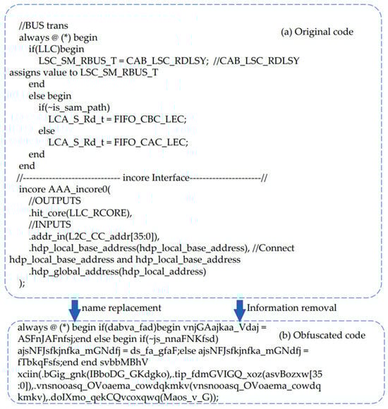The information removal method is employed to eliminate hints in the RTL code that explain the function of the code and the meaning of variables. These details could aid attackers in analyzing the RTL code, necessitating the removal of these insecure comments. Also, there are a lot of spaces in the code that are added to make the code easier to read, and these spaces make the structure of the code clearer. In order to increase the difficulty of analyzing the code, all the spaces that do not affect the operation of the code are removed during the obfuscation process to make the structure of the code more compact and difficult to read [18].
