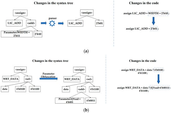 During the parsing of the RTL code, mathematical operations involving the original parameters are concealed and substituted with the result of the operation. As illustrated in Figure 5a, the parameter addition operation represented by <add> is substituted with the result of its operation. The corresponding code has also changed as shown in the figure. Subsequently, the obfuscation tool randomly selects a suitable node in the syntax tree, and the node is altered to a meaningless mathematical operation. False and meaningless parameters are then introduced into the operation for the purpose of disruption. As shown in Figure 5b, data 4′b0100 is replaced by an equivalent addition operation with false parameter.